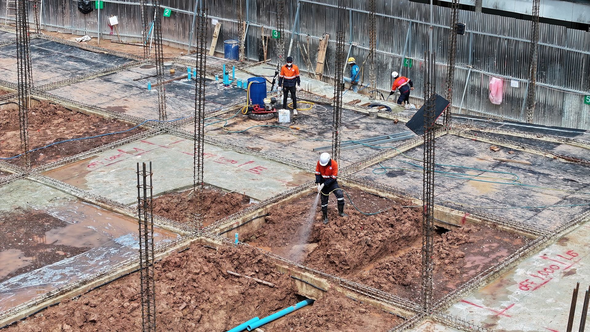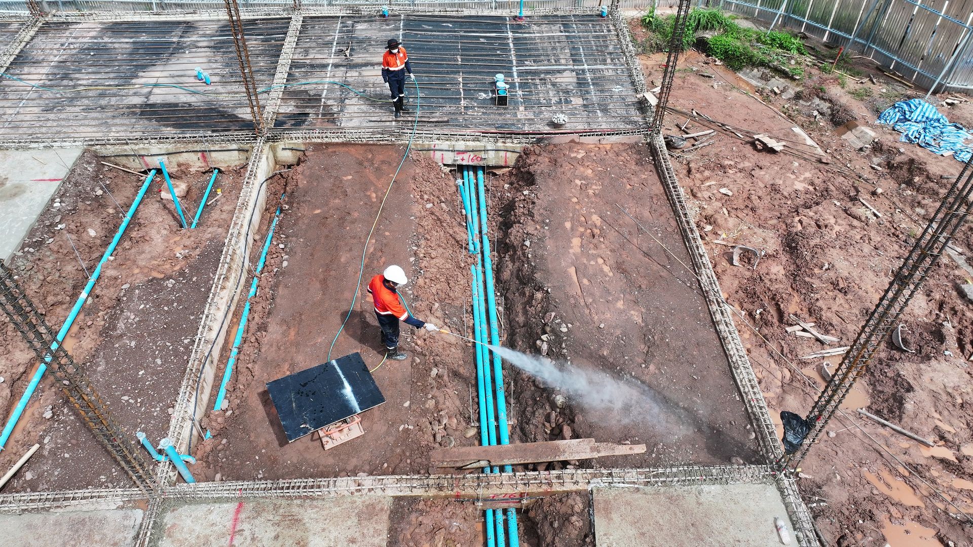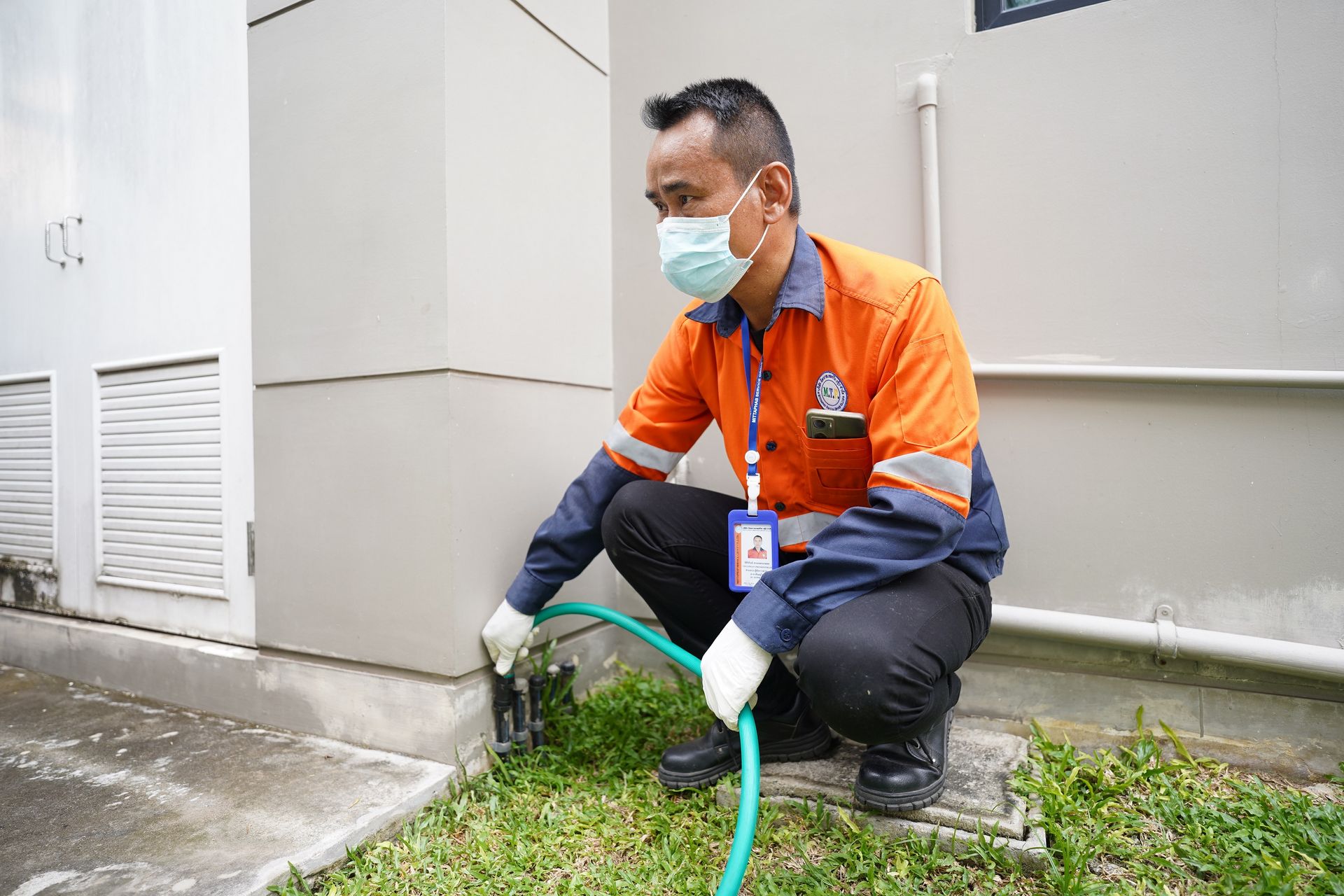 เจ้าหน้าที่จะเริ่มดำเนินการหลังจากทางฝ่ายก่อสร้าง ได้ทำการเทคานคอดินเสร็จเรียบร้อยแล้ว โดยเจ้าหน้าที่จะทำการวางท่อติดกับแนวคานด้านใน รอบตัวอาคาร ท่อน้ำยาเคมีจะมีวาล์วอัดน้ำยาเคมีไว้รอบอาคารเป็นช่วง ๆ สำหรับอัดน้ำยาเคมีเข้าไปใต้พื้นอาคารได้ตลอดอายุบ้าน
