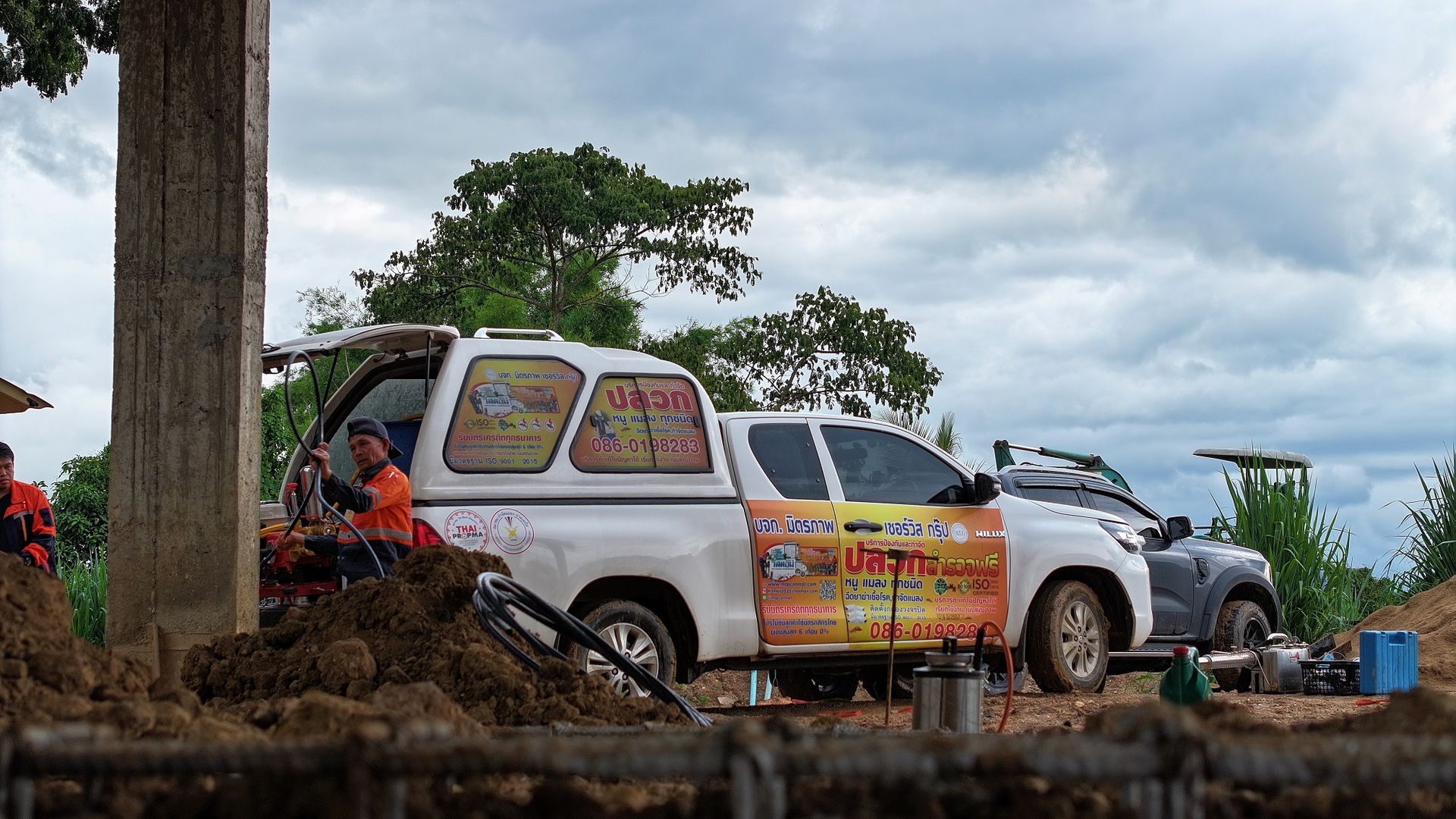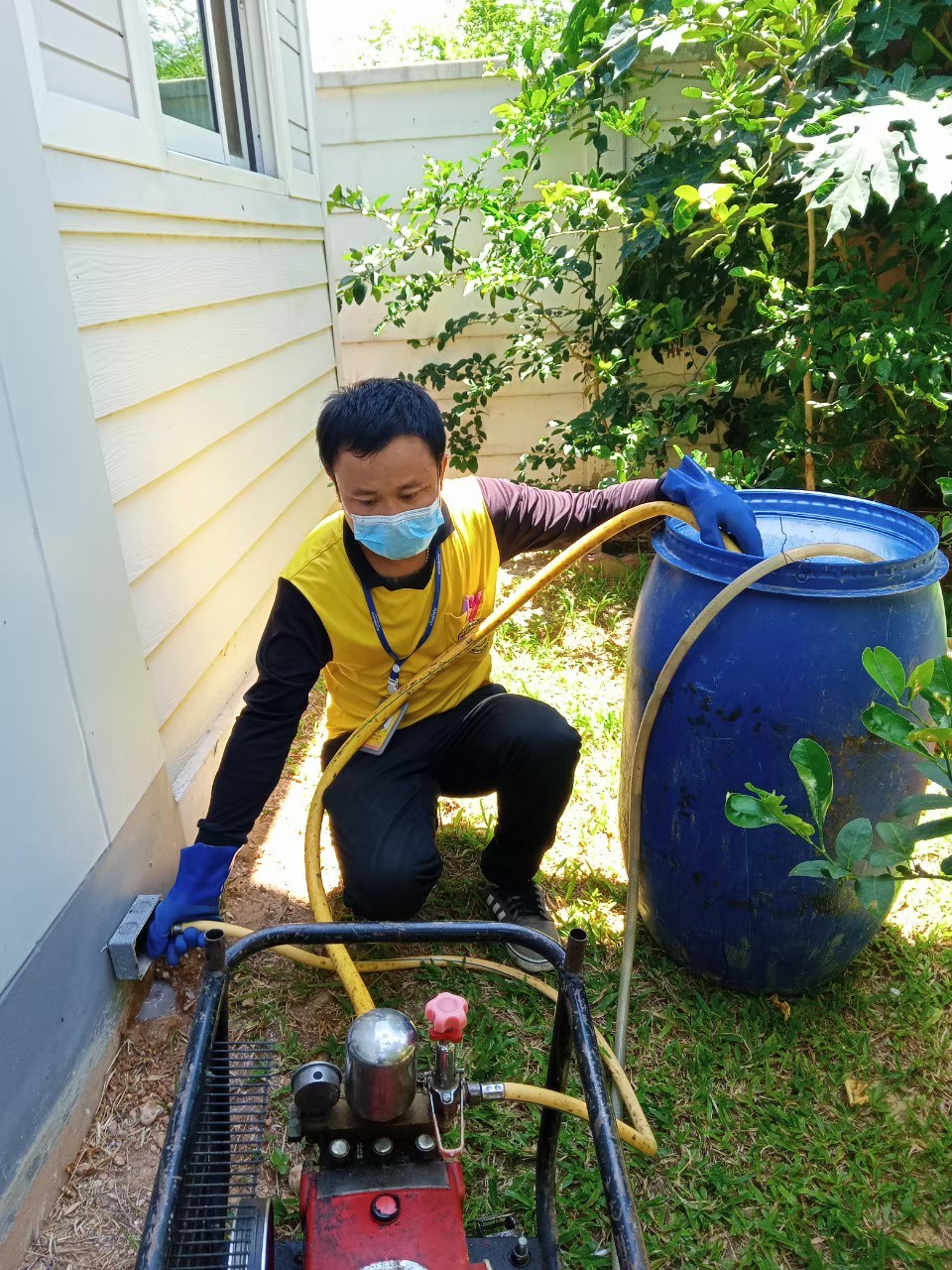 1. หลังจากวางท่อน้ำยาเคมีเรียบร้อยแล้ว ฝ่ายก่อสร้างสามารถปรับพื้นดินก่อนเทคอนกรีต เจ้าหน้าที่จะทำการอัดน้ำยาภายในตัวบ้านทุกตารางเมตร โดยใช้หัวอัดน้ำยา (High Pressure Injector) ปักลงไปในดินประมาณ 50-100 เซนติเมตร และอัดน้ำยาลงดินตารางเมตรละ 5 ลิตร หลังจากอัดน้ำยาลงดินเรียบร้อยแล้ว เจ้าหน้าที่จะฉีดพ่นสารเคมีพรมหน้าดินอีก 2 ลิตร ต่อ 1 ตารางเมตร