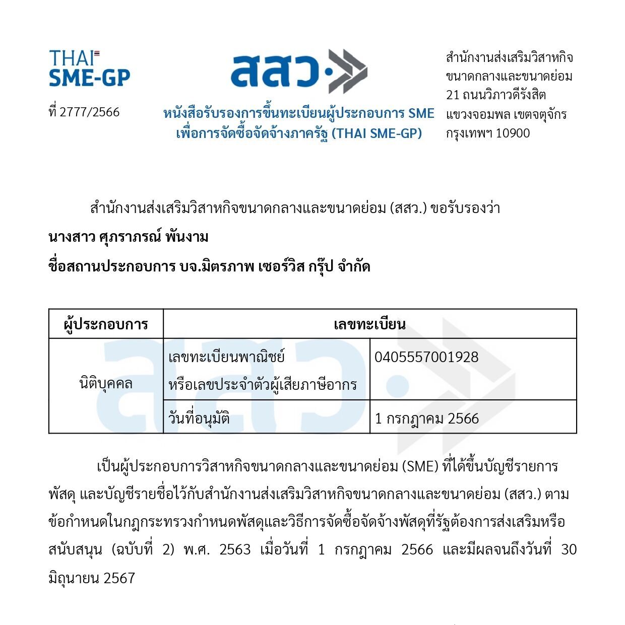 ขนาดกลางและขนาดย่อม หนังสือรับรองการขึ้นทะเบียนผู้ประกอบการ SME สำนักงานส่งเสริมวิสาหกิจขนาดกลางและขนาตย่อม(สสว.) ขอรับรองว่า นางสาว ศุภราภรณ์ พันงาม ชื่อสถานประกอบการ บจ.มิตรภาพ เซอร์วิส กรุ๊ป จำกัด ผู้ประกอบการ เลขทะเบียน เลขทะเบียนนิติบุคคล 0-4055-57001-928 วันที่อนุมัติ 1 สิงหาคม 2564 เป็นผู้ประกอบการวิสาหกิจขนาตกลางและขนาตย่อม(SME) ในพื้นที่จังหวัดขอนแก่น ที่ได้ขึ้นบัญชีรายการพัสตุ และบัญชีรายชื่อไว้กับสำนักงานส่งเสริมวิสาหกิจขนาดกลางและขนาดย่อม (สสว.) ตามข้อกำหนดในกฎกระทรวงกำหนดพัสตุและวิธีการจัดซื้อจัดจ้างพัสดุที่รัฐต้องการส่งเสริมหรือ สนับสนุน (ฉบับที่ 2) พ.ศ.2563 เมื่อวันที่ 1 กรกฎาคม พ.ศ. 2566 และมีผลจนถึงวันที่ 30 มิถุนายน พ.ศ. 2567